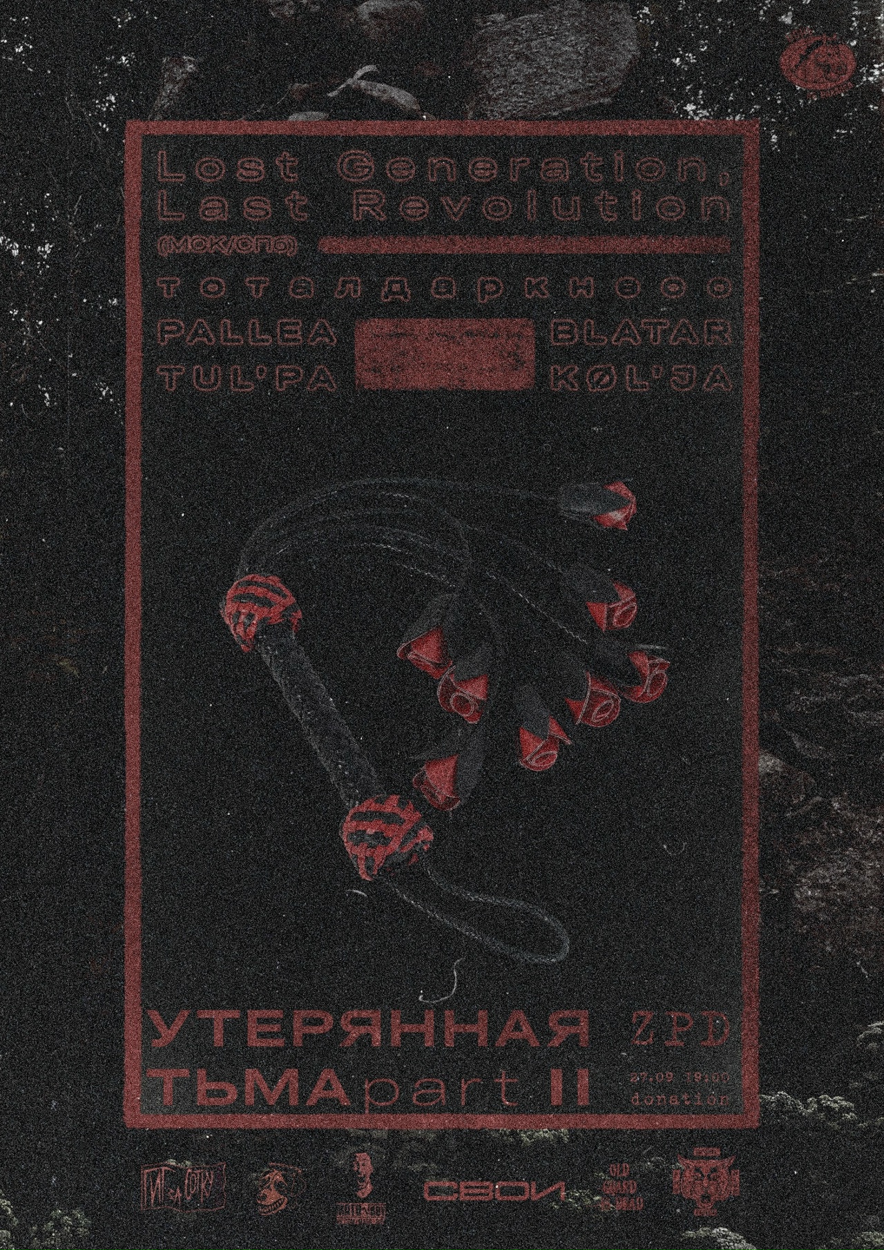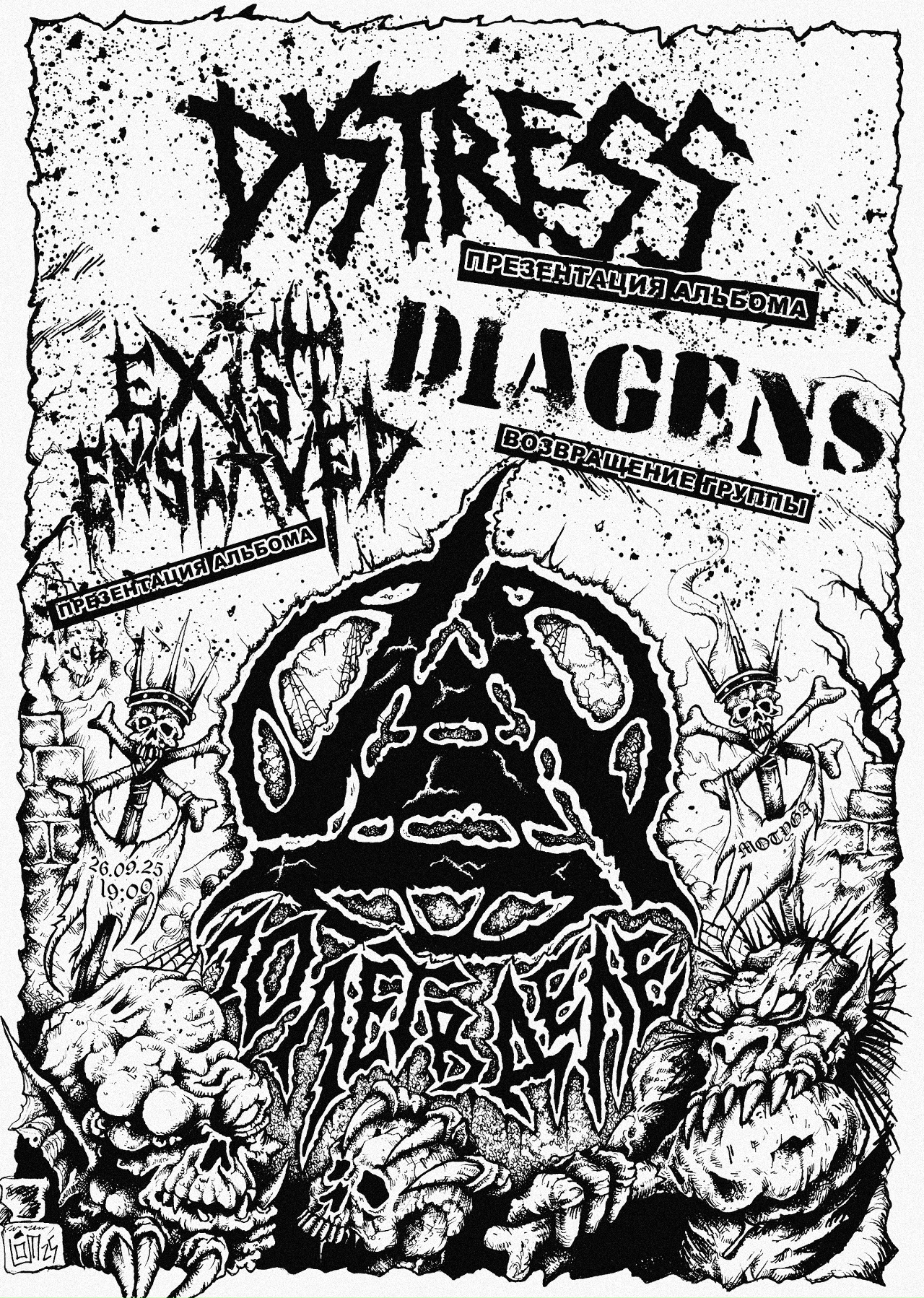 Громкая и тяжелая неделя без лишних слов и эмоций. Блэк, краст, хардкор, «Горгона». Встречаем холод осени музыкальной стужей. А еще реюнионы и новые альбомы от ветеранов сцены, в общем, все как мы любим. Надеемся, вы тоже. ![]() Автор: Иль Янин Алхимия отмечает в «Мотыге» свое десятилетие, Москва![]() Команда «Алхимии» отмечает десять лет своей чрезвычайно плодотворной деятельности. Все это время алхимики варили в андерграунде концерты, релизы и не только, так что и празднование юбилея намечается громким. На сцене краст-ветераны Distress с новым альбомом (!), краст-варвары Exist Enslave тоже с новым альбомом (!!) и вернувшиеся к лайв-выступлениям панки Diagens (!!!). В общем, будет круто, приходите угарнуть. 26 сентября / бар «Мотыга» / 18:00 / от 1700 р. Утерянная тьма в Linza Loft и ZPD, Петербург и где-то под Великим НовгородомНебольшой тур то ли пауэрвайоленс, то ли эмовайоленс коллектива Lost Generation Last Revolution с поддержкой из не менее отпетых музыкантов. Группу поддержат дибитеры Dodui и приблэкованные крастеры «Отёк» с, внезапно, синтами, горнойзеры Urinary Tract Collapse, скримо-группа Pallea и другие представители экстремально жуткой (в хорошем смысле) сцены. 26 сентября / Linza Loft / 19:00 / от 500 р. 27 сентября / ZPD / 19:00 / free God Doom It Fest в «Урбане» и в «Сердце», Москва и ПетербургСуровый думный фест отечественных групп с историей: сладж-думеры Pressor и дум-машины «ИЛ» выбрались из болот, чтобы выступить с постдумерами Below The Sun (навещают нас аж из Красноярска) и Who Dies in Siberian Slush. Все коллективы более чем заслуженные и валят тягучее тяжелое музло уже многие лета. И, что важно, в думу будут обе столицы. 26 сентября / клуб «Сердце» / 18:30 / от 2100 р. 27 сентября / клуб «Урбан» /18:30 / от 2100 р. Холодная осень в «Лахесисе», Москва![]() Большой осенний концерт всеми любимых групп. На сцене дарк-постпанк от «Затмим», альтернативный концептуальный рок от «Линии Бикини» (наши впечатления от их недавнего релиза читайте здесь), конечно, группа «Горгона» (все три перечисленные коллектива вновь отлично показали себя на нашем Minimum Pop фесте в конце августа), а также гость из Владимира Анатолий Благовест со своим ансамблем, хардкорщики Trunk и Ugly Law и многие другие. Греющий душу лайнап, чтобы согреться холодным осенним вечером. 27 сентября / «Лахесис» / 17:00 / от 1200 р. Gnot, Ochag, Smyčka и «Этила Эфир» в «Складе №3», Москва![]() Вечер черновечер: постблэкеры Gnot представляют свой новый альбом, а на одной сцене с ними выступят постблэкеры Smyčka и «Этила Эфир», а также чернокорщики Ochag. А что еще нужно для 27 сентября / «Склад №3» / 19:00 / от 1001 р. День Горошка на базе «Спотыкач», Москва![]() Блэк встречает постпанк на репетиционной точке «Спотыкач». Кто такой Горошек и кто соберется с ним на дне, мы не знаем, но знаем, что вечер получится громким. За милой афишей скрываются группы с чуть менее милыми названиями, например, Zverzost или «Кровохлёбка». Что играют? А мы написали в самом начале. 27 сентября / Спотыкач / 18:00 / от 550 р. Подписывайтесь на Sadwave в социальных сетях: 👉Поддержать Sadwave донатом 👉 Выиграть панк-футболку Больше концертов в паблике наших друзей Into The Void ![]() |