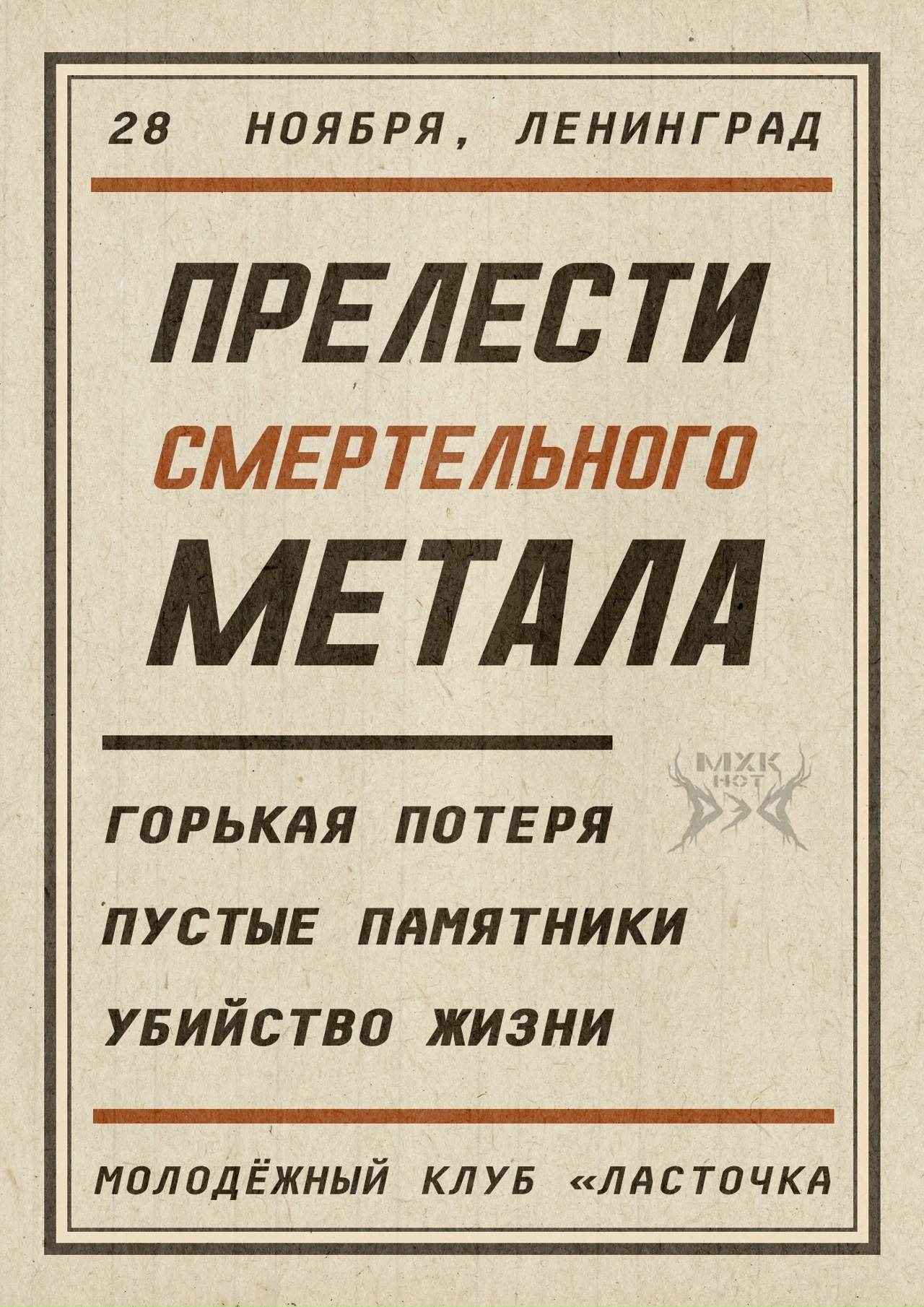 Завершаем осень очень творческим уикэндом. Много арт-панка, много экспериментальной музыки. Душевные концерты в теплых клубах, несколько эмо-операций на открытом сердце, ска-панк, хардкор и стрит-панк для веселья и психоделика для размышлений. ![]() Автор: Иль Янин «Зреет» в Eclipse, Москва![]() Презентация дебютного и долгожданного (четыре года работы!) альбома стоунер-метал, даже, пожалуй, каяс-метал-группы «Зреет» на лунной сцене клуба Eclipse. Команду массивно поддержат сладжеры Protoslon. 28 ноября / Eclipse / 20:00 / 1000 р. Uratsakidogi в клубе Pravda, Москва![]() Вестники блэк-хопа и зимней стужи, завсегдатаи Minimum Pop феста Uratsakidogi покинули арктическое гетто, чтобы напомнить Москве, что такое настоящие холод и тьма. Оледенение душ запланировано уже в эту пятницу! 28 ноября / клуб Pravda / 20:00 / от 2000 р. День рождения клуба «Склад №3» в «Складе №3», МоскваУ «Склада №3» день рождения – с др! Уже три года клубу, только представьте. Поэтому отмечается праздник шумно, громко, с размахом и в течение аж трех дней. Начнется все в пятницу с поздравительного концерта эмо- и арт-панк-групп лейбла «Фузз и дружба». Такие жанры, чтобы задать тон празднику и чтобы вы не расслаблялись. За эмо часть отвечают команды с душераздирающей музыкой, которая заставит вас каждым нервом прочувствовать весь спектр эмоций: -1 и «мало». Берегите сердца. С арт-панк программой выступят «Позоры» и шумо-рокеры «Ходьба». В субботу – лайнап, подобранный специально для своих гостей командой клуба «Склад №3». Выступят Света Матвеева (вокалистка магического шугейз-проекта «Деревянные киты»), дарк-джаз-экспериментаторы «Бром» и другие замечательные инди-коллективы отечественной сцены. В воскресенье – поздравление от лейбла «роса». Ожидаемо много исполнителей в жанрах с приставками арт-, нойз- и экспериментальный-. Короче, все как мы любим. А именно «фрезер ц», «dyvӧ» и другие достойные команды. 28 ноября / «Склад №3» / 19:30 / от 1200 р. 29 ноября / «Склад №3» / 18:00 / от 2000 р. 30 ноября / «Склад №3» / 18:00 / от 800 р. Devil’s Black Shoes и Sick Boys в Fish Fabrique, Петербург![]() Душевный и в каком-то смысле духоподъемный ска-панк за жинь Devil’s Black Shoes разгоняет тоску и печаль петербургского вечера в пятницу. Поддержат их в этом начинании панк-н-ролльщики Sick Boys. Прогоняем уныние и радуемся жизни даже на мрачной финишной прямой ноября. 28 ноября / Fish Fabrique Nouvelle / 19:00 / от 800 р. «Бетонный кубик» в «Ла́хесисе», Москва![]() Набирающий популярность экспериментально-удивляющий фестиваль для вечно молодых и не только. Проходит уже в двадцатый раз (!) за пять лет (!!!). Поэтому на двух сценах выступают двадцать исполнителей со спорными и приличными названиями и с музыкой широкого жанрового разнообразия. Неважно, кто вы, пресыщенный искусством артси, богема, панк, закошмаренный обыватель, «кубик» откроет что-то новое каждому из вас. 28 ноября / «Ла́хесис» / 19:00 / от 700 р. North Emo Community в «Цоколе», Петербург![]() Как будто мало было нам этой темени за окном и поздней петербургской осени, контрольным выстрелом в самое сердце нас решили добить еще и эмо-группы. Души в клочья они рвут переливами стеклянных гитар, ловко подобранными септ-аккордами и громкими криками из глубин существования. Любоваться со сцены нашими слезами планируют Call Us Колос, -1, «Узник» и Veresk. 29 ноября / «Цоколь» / 19:00 / от 1000 р. Бритый и ворчливый отмечает 35 лет в «Смене», Москва![]() Присоединяемся к поздравлениям и желаем настояще