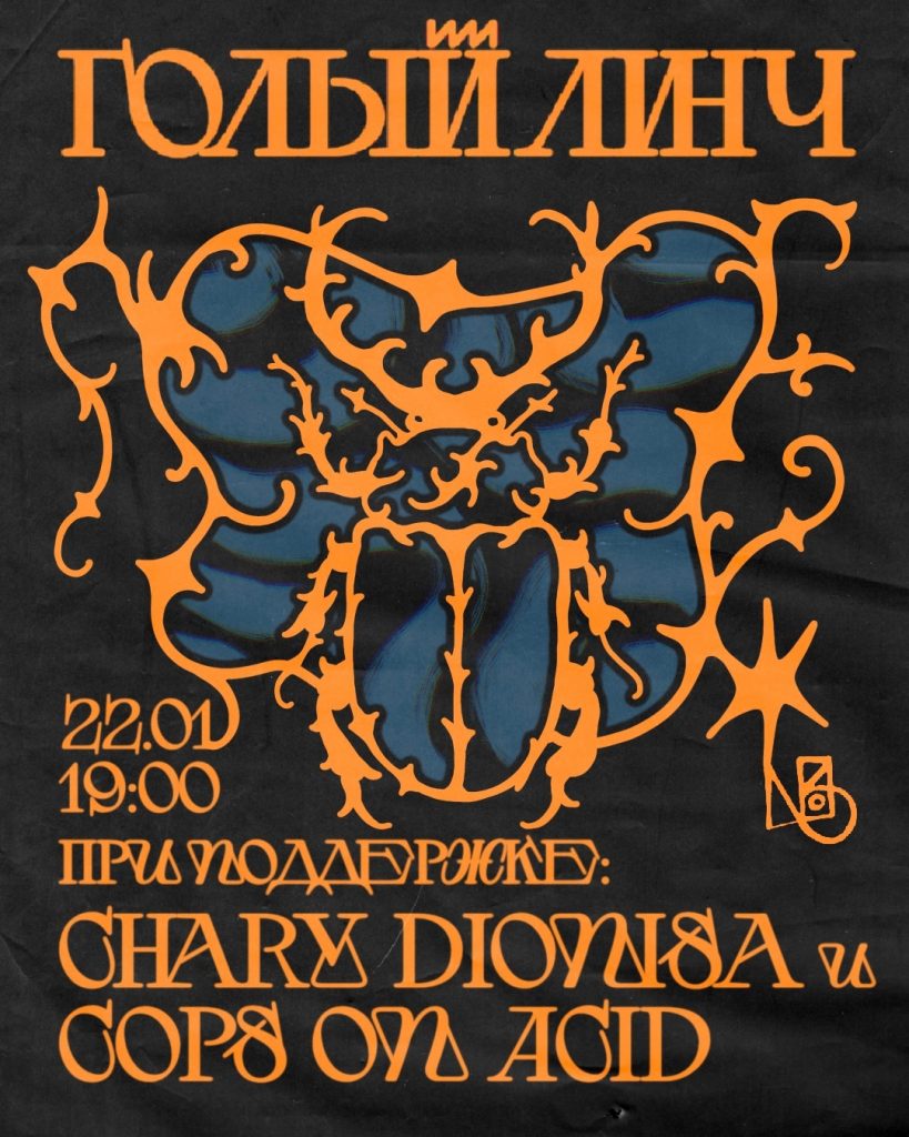 Самобытный инди-рок коллектив «Голый Линч» представит на закате рабочей недели альбом «Тело жука» (нашу рецензию читайте в среду). Неуловимо ностальгичное звучание с нотой психоделии и классического рока/панк-рока – самое то для приятного вечера четверга, пока за окном трещат морозы. Поддержат и усилят теплую атмосферу психоделик-рокеры Chary Dionisa и психоделик-арт-рокеры Cops On Acid.