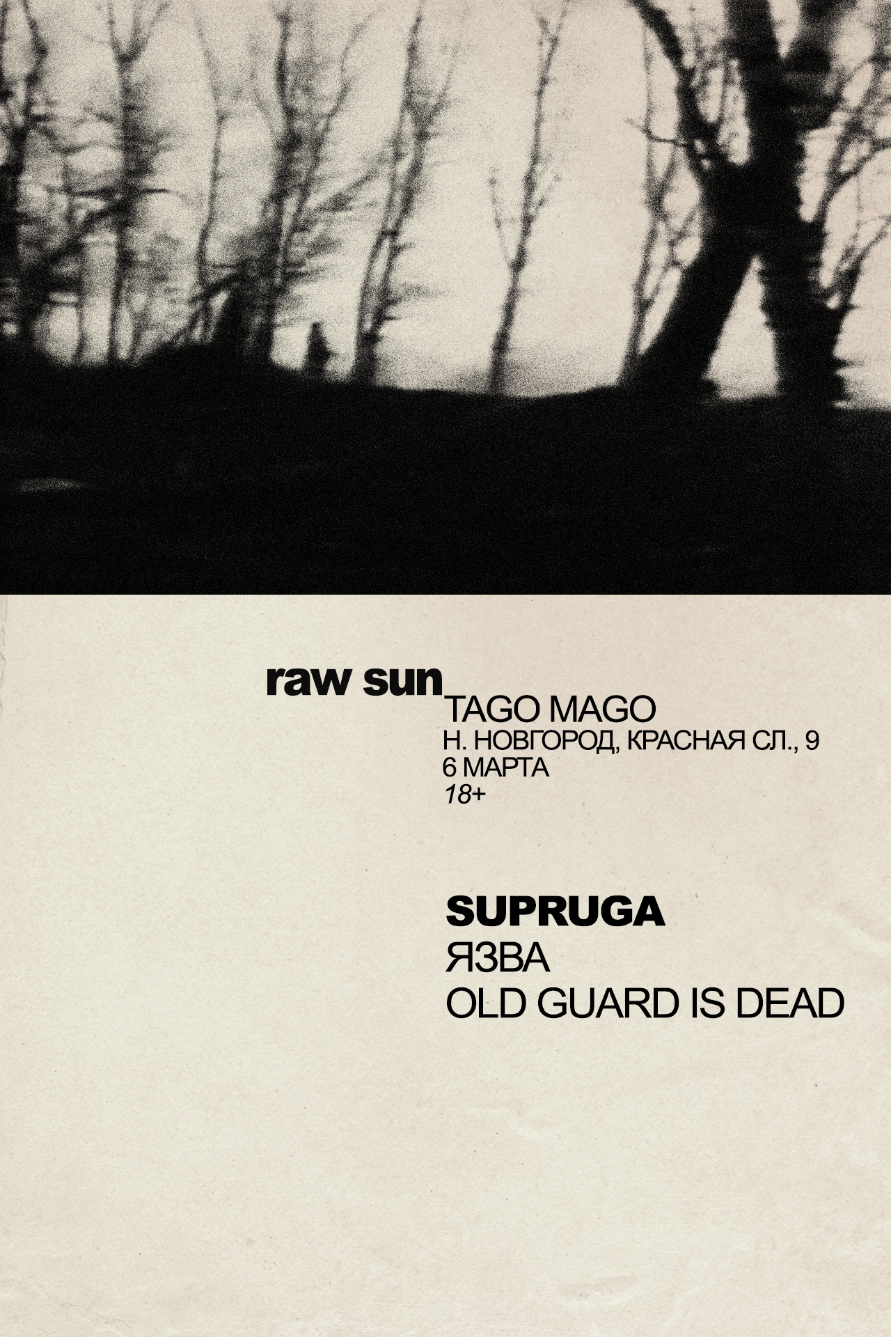 Темнейший метал-хардкор на стыке с блэком прозвучит в трех крупнейших городах страны. Supruga приезжает и выступает при поддержке мрачных музыкальных местных коллективов, дэтовых, блэковых, панковых. В Нижнем это «Язва» и Old Guard is Dead, в столице – Black Acid и «Этила Эфир», а в Петербурге Potvor с кларнетом (ну как не упомянуть) и нойз-панки Unisex.