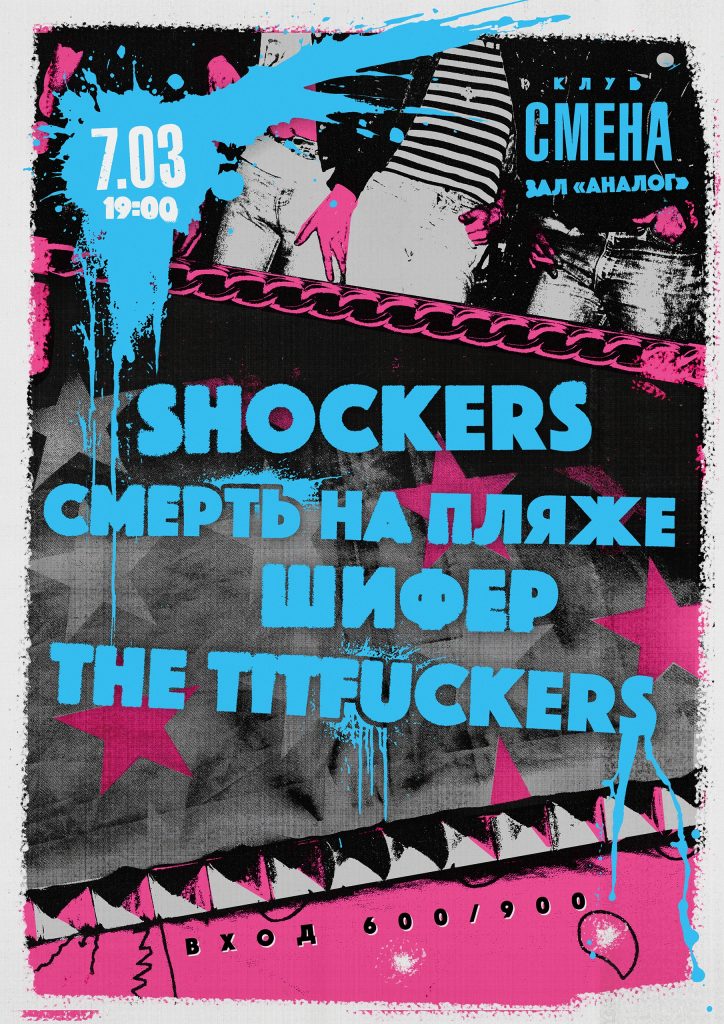 Кайфовый панк-концерт запланирован в столичной «Смене» в субботу. Четыре группы в лайнапе и, представьте себе, у нас есть рецензии на релизы почти каждой из них. И всех хвалим. Оргкорщики «Смерть на пляже» (рецензия), злободневные «Шифер» (пока без рецензии), взрослые поп-панки-хулиганы The Titfuckers (читать) и The Shockers (рецензия). Чувствуем, будет весело и душевно.