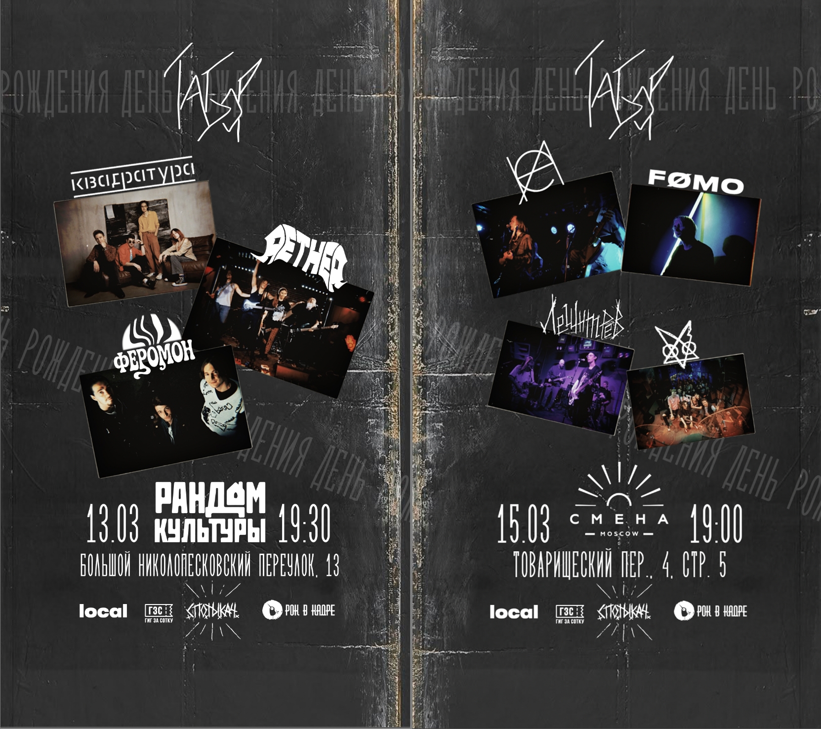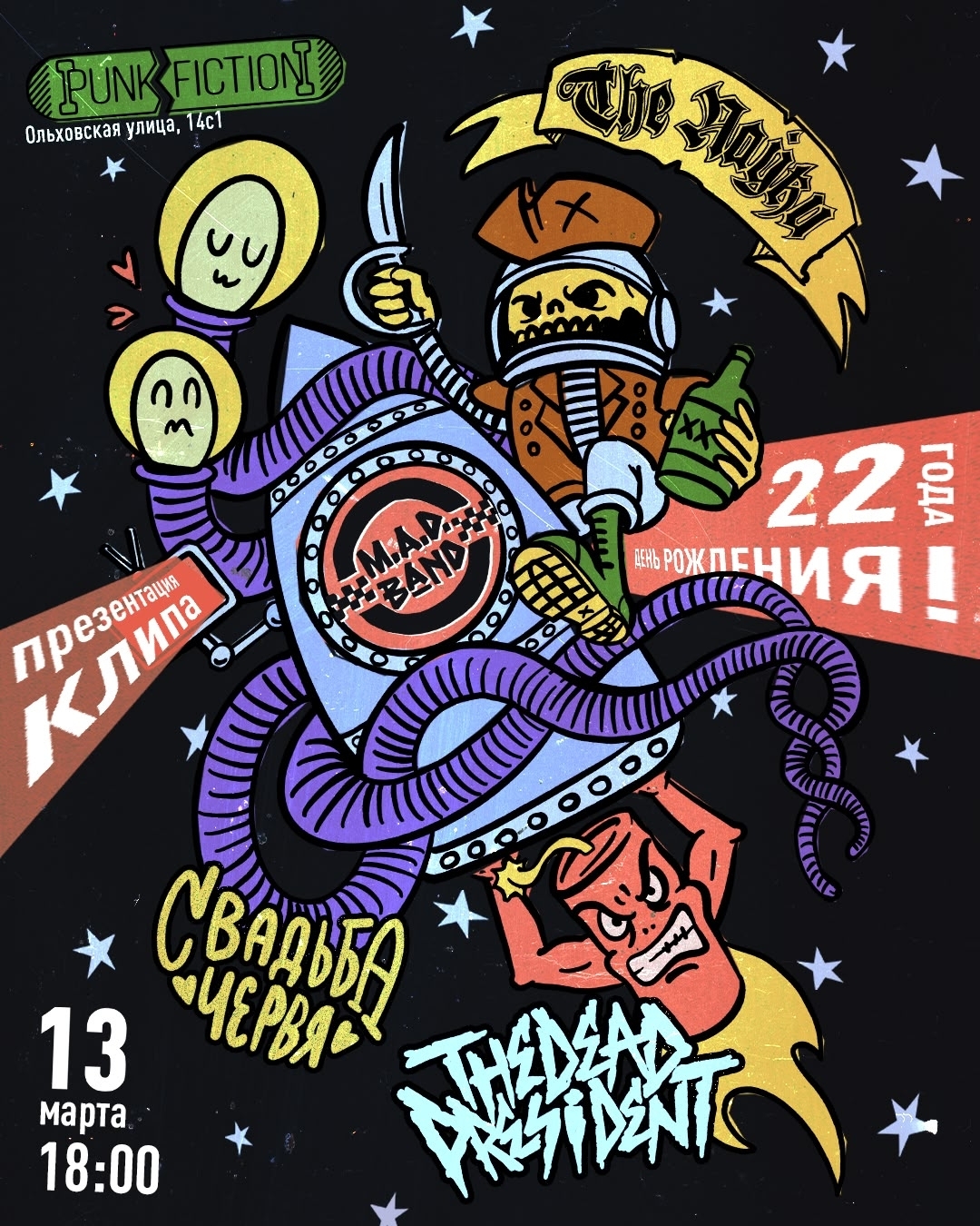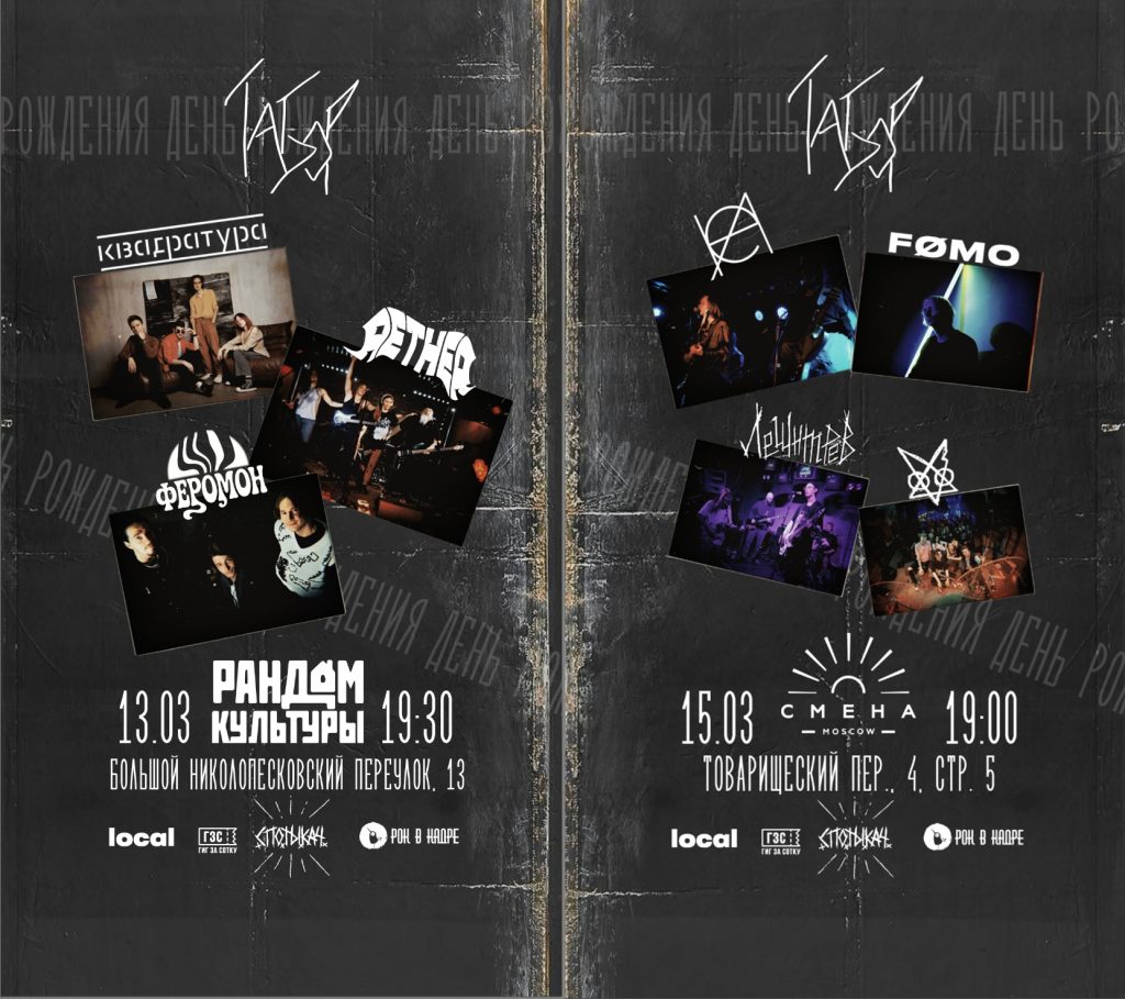 Первые теплые дни, и даже пятница 13-е не напугала музыкантов – концертов все больше. Можно сказать, все больше с каждой неделей. Есть хоррор-панк и краст, есть эмо и дэт-метал, есть гаражный рок и психоделика. Начинаются времена, когда нам приходится выбирать концерты из массы интересного. И, поверьте, это всегда очень сложно. Но вы не стесняйтесь, присылайте нам через бот анонсы, а мы посмотрим, попадут они в подборку или нет. ![]() Автор: Иль Янин 22 года M.A.D.Band в Punk Fiction, Москва![]() Как удачно совпало: и пятница, 13-е, и день рождения бывалой ска-панк группы M.A.D. Band. Вообще, 22 года – это не шутки. Получается, группа отдельно от ее участников уже четыре года как может покупать себе пиво и сигареты, а в принципе еще и закончить университет бы успела. Знаменательное событие своими выступлениями также скрасят не менее бывалые панки The Пауки, а также панки «Свадьба Червя» и ска-панки/скакорщики The Dead President. 13 марта / Punk Fiction / 18:00 / от 1200 р. Bird Bone и НДвТБ в «Ласточке», Петербург![]() Эмо-панки 13 марта / «Ласточка» / 19:00 / от 1500 р. Friday The 13th vol. VIII в «Смене», Москва![]() Пятница 13-е, надо пугаться и веселиться. И для этого существует хоррор-панк. И – только представьте! – хоррор-панк концерт как раз и запланирован в эту пятницу, 13-е! Какая удача. И группы как молодые, так и уже состоявшиеся, но все достойные прослушивания и угаров: Chaneys (завсегдатаи нашего Minimum Pop Fest), Molly Fancher, «Псы Юрского Периода» и «Культ Боли». 13 марта / «Смена» / 19:00 / от 500 р. Black Friday Fest в «Мо[три]», Москва![]() Жутких концертов в жуткую пятницу достаточно, но есть и другие! Игривая музыка с загадками тоже запланирована, например, в «Мо[три]»: шумные гаражжжные рокеры «Задача Трех Тел», разносторонне играющие альтернативные металисты Ferrum, альтернативщики «Поколение Питера Пэна» и постгранжеры «Вставка». 13 мартя / «Мо[три]» / 18:00 / от 500 р. Пятница 13 blackened в Peak Sound, Москва![]() Пугают в жуткую нас или пугаем мы? Вопрос остается открытым. В принципе, это повод кошмарить обывал, и мастер-класс по окошмариванию обывал дают очерненные крастеры и дибитеры: Potvor с кларнетом (подробнее читайте здесь), Heroin, «Отшельник» и «Блёв» – эти без кларнета, но не менее злющие. 13 марта / Peak Sound / 18:13 / от 1666 р. Пять лет клубу Tago Mago, Нижний Новгород![]() Пять лет исполняется нижегородскому клубу Tago Mago, собравшему вокруг себя творческую тусовку и продвигающему андерграундный движ в регионах. Это похвально! Юбилей отмечается аж в два дня с интересным лайнапом. Ни на что не намекаем, но от Москвы не так уж далеко, и как раз весна началась и теплые дни… Выступят давно известные нам и вам ветераны среди ветеранов «НОМ», гаражные хулиганы и разбойники Donjuans, рокеры-металисты «Змееед», стоунер-жир-метал «Гавайский Бомж», многие другие коллективы и также диджеи. Ожидается отличная музыка и много прекрасных людей. 13 и 14 марта / Tago Mago / 19:30 / от 800 р. Сахарная орбита в «Складе №3», Москва![]() Межпространственно-психоделический вечер для путешественников по измерениям и не только. Выступают коллективы с красивой и необычной музыкой. Вас ожидает вдумчивая гаражная неопсиходелика от Orwell’s Magazine, вневременной космический психоделик-рок от команды «Сахарный Человек», шумные гаражные рокеры «Задача Трех Тел» и другие. 14 марта / «Склад №3» / 19:00 / от 600 р. Grave Secrets X в «Мо[три]», Москва![]() Точите и шлифуйте боевые топоры до ослепляющего блеска, латайте кожаный доспех, то есть боевую кур