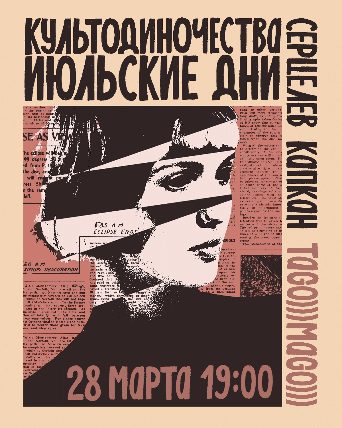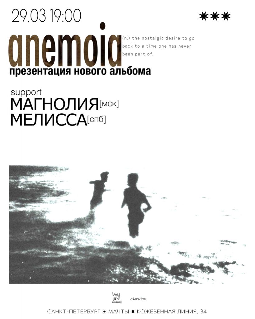 Насилие над музыкой, инструментами и нашими ушами – а мы рубимся, прыгаем со сцены, топчем друг друга и просим еще, потому что идите нахер, вот почему. 28 марта / «Ласточка» / 19:00 / от 1000 р. Cyber Mosh в «Мо[три]», Москва![]() Мош-балдеж для любителей битдаунов и прочего хардкора. Заряжают злостью и рубят мощное музло The Rite, Attribute, Negative Selection, которые прибыли аж из Смоленска, Орла и Петебурга, чтобы расшатать Москву, а также местные No Reload и Led Ashtray. Нас ждут бластбиты и серклпиты, вертухи и мелочь на полу, единомышленники и яростные ритмы, молодость и ненависть, а еще немного металкора. 28 марта / «Мо[три]» / 19:00 / от 1000 р. Hopelake, Heavy plane и «Харп» в Punk Fiction, Москва![]() Мелодичные панки Hopelake уходят в тур и начинают, как водится, со столицы. Резонируют с ними душевные шугейз-панки Heavy Plane и нойз-рокеры «Харп». Звук отражается от рамп Punk Fiction и создает неповторимую атмосферу для теплого субботнего вечера в кругу друзей и других интересных людей. 28 марта / Punk Fiction / 19:00 / от 800 р. Grave Disgrace и Anotherside в Eclipse, Москва![]() Много лет дымящая на сцене дум-стоунер-группа Grave Disgrace записала новый альбом, «Helldiver», а теперь презентует его в столице. Неделю назад жиродымом накрыли Петербург, теперь вот очередь Москвы. В поддержке – контрастно быстрый, но не менее темномагически-болотный дэт-метал от Anotherside. 29 марта / Eclipse / 19:00 / от 2000 р. Anemoia, «Магнолия» и «Мелисса» в клубе «Мачты», Петербург![]() Стена звука и ураган эмоций ожидает нас на презентации нового альбома мечтательных эмо-панк-шугейзеров Anemoia. Поддержат коллектив не менее шумные и эмоциональные «Магнолия» и «Мелисса». Все три команды еще и припрятали в рукаве гитарные и ритмические панк-козыри, чтобы у посетителей совсем отвал башки случился. Эмогейз? Панкгейз? В любом случае, красиво, ностальгично, с полным погружением в звук и в клубе с видом на залив – не стыдно будет и слезу пустить от переизбытка чувств. 29 марта / «Мачты» / 19:00 / от 800 р. Подписывайтесь на Sadwave в социальных сетях: 👉Поддержать Sadwave донатом Больше концертов в паблике наших друзей Into The Void ![]() |